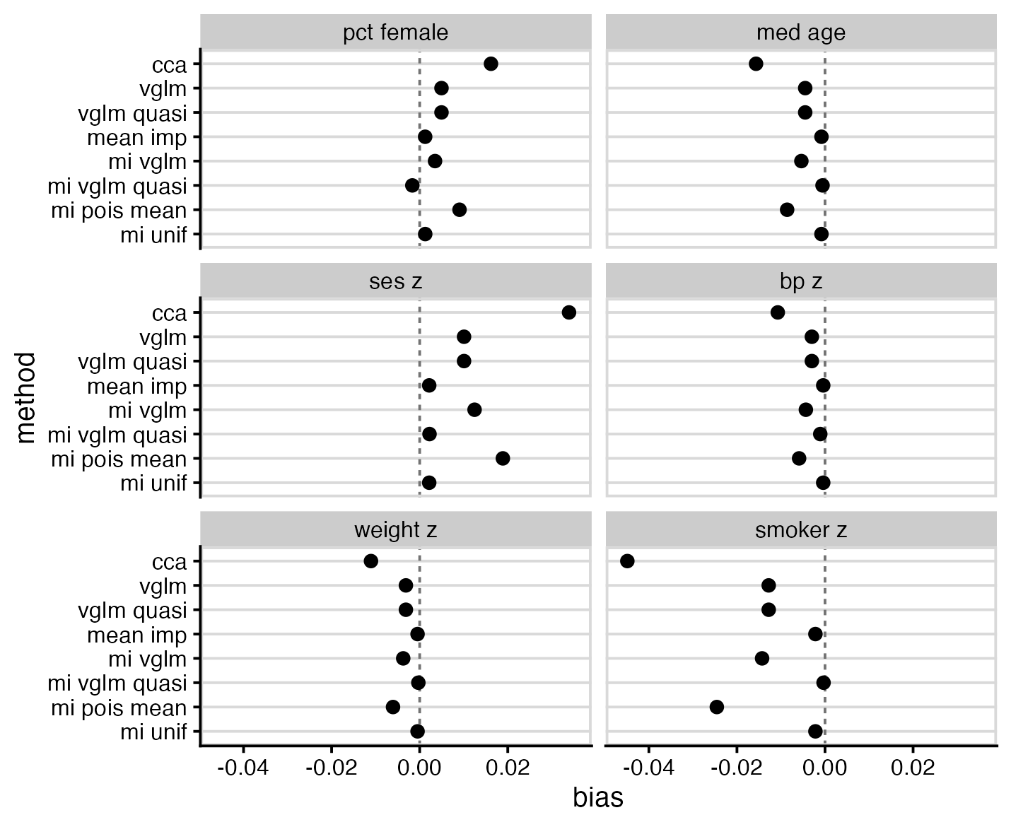 full: Analysis of the full (non-censored) data using a quasi-Poisson model was performed as a check that the data generation process and analysis models were working as expected, but not presented in the results belowcca: Complete case analysis. Censored observations are removed, then a quasi-Poisson model was fit to the remaining datavglm: Left-censored Poisson regression using theVGAMpackagevglm quasi: Left-censored quasi-Poisson regression. This was implemented by fitting a Poisson regression using theVGAMpackage, then inflating standard errors based on estimated overdispersionmean imp: Mean imputation. Censored observations are replaced by 2.5, the mean of the values they could possibly take, then a quasi-Poisson model was fit to the data.mi vglm: Multiple imputation using left-censored Poisson regression, followed by a quasi-Poisson model fit to the imputed datami vglm quasi: Multiple imputation using left-censored quasi-Poisson regression, followed by a quasi-Poisson model fit to the imputed datami pois mean: Multiple imputation using an intercept-only Poisson distribution (as demonstrated by Peter Ellis previously), followed by a quasi-Poisson model fit to the imputed datami unif: Multiple imputation using a uniform distribution, followed by a quasi-Poisson model fit to the imputed data